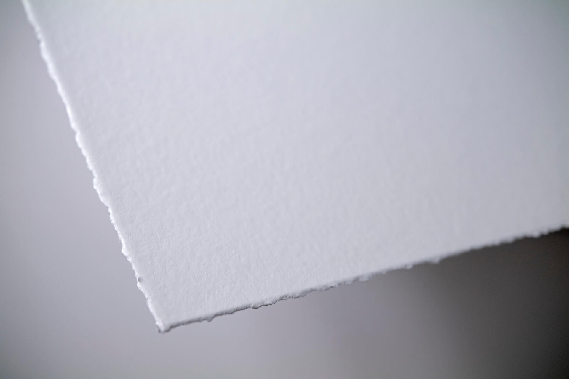A heavyweight 100% cotton rag fine art paper with a delicate matte surface texture. It is similar to German Etching, but its surface is smoother and overall weight thicker. Its natural white tone and weight make it a perfect choice for watercolor and collage works with fine details. This paper is available in 17” x 22” deckled edge sheets that have a gorgeous handmade feel.