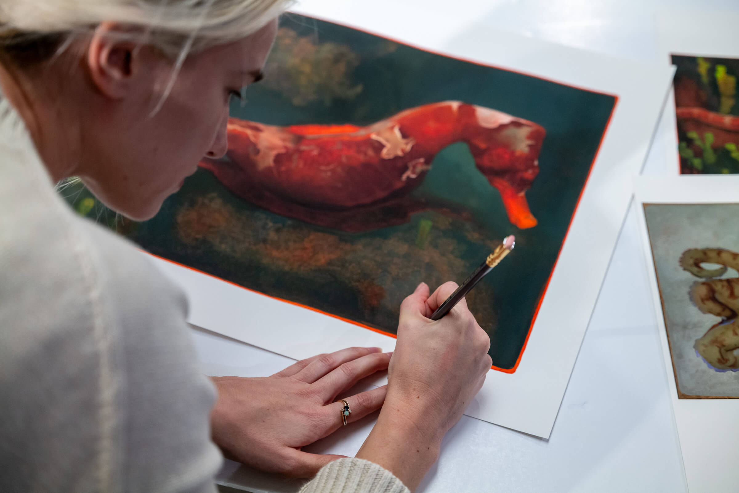 Savannah Tate Cuff is a Brooklyn-based painter hailing from Cincinnati, Ohio. She graduated from Angel Academy of Art in Florence, Italy in 2014, and went on to complete the four-year program at Grand Central Atelier in New York City in 2018. While traditionally focused on figure painting and portraiture, Savannah being an avid diver has extended her concentration to aquatic life. She has taught multiple workshops domestically and abroad, and in 2020 she received the Alma Shapiro Rome Prize to draw from classical sculpture and paint Old Master copies in museums in Rome.